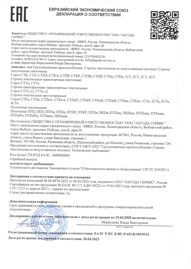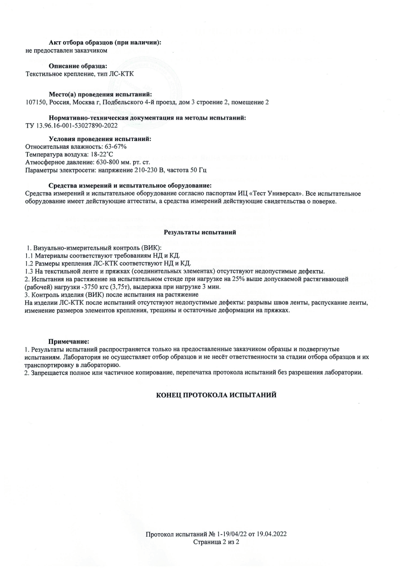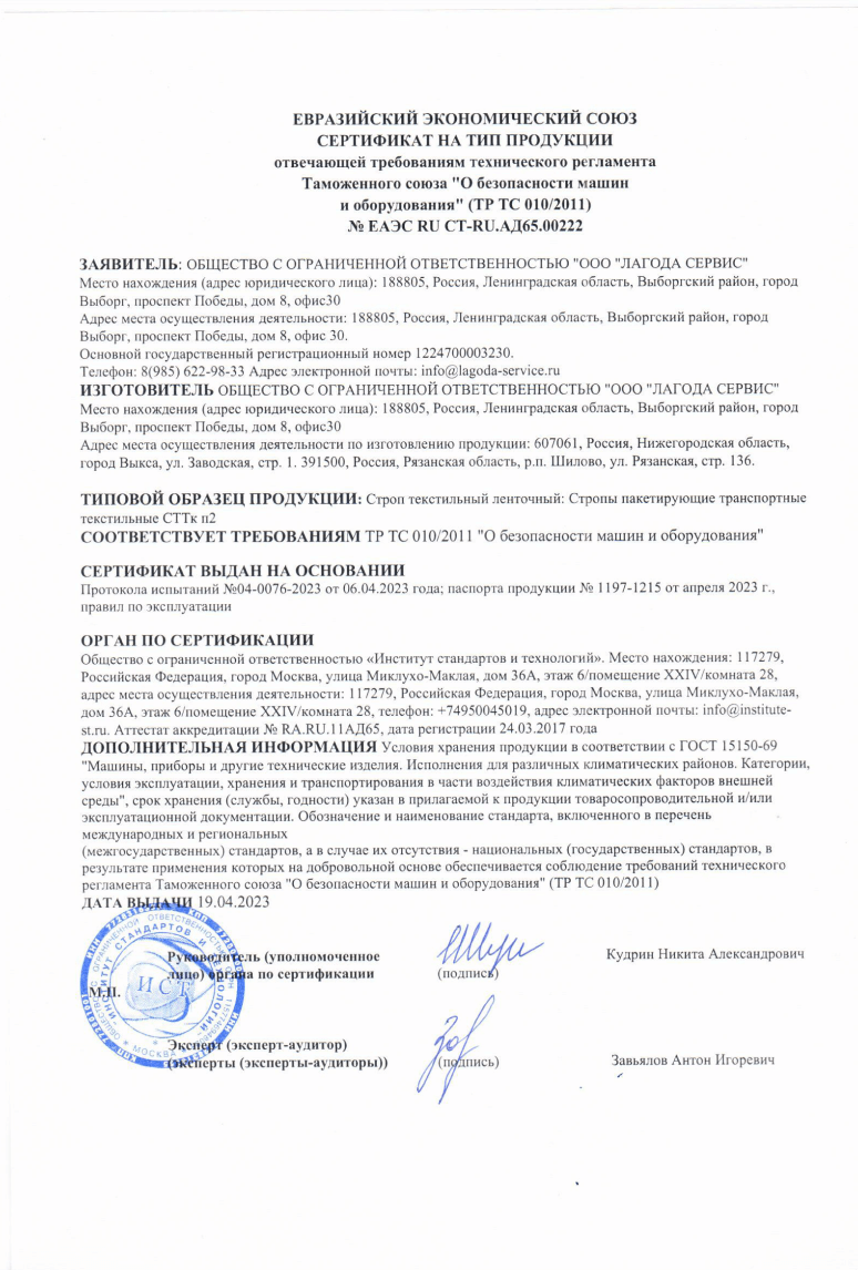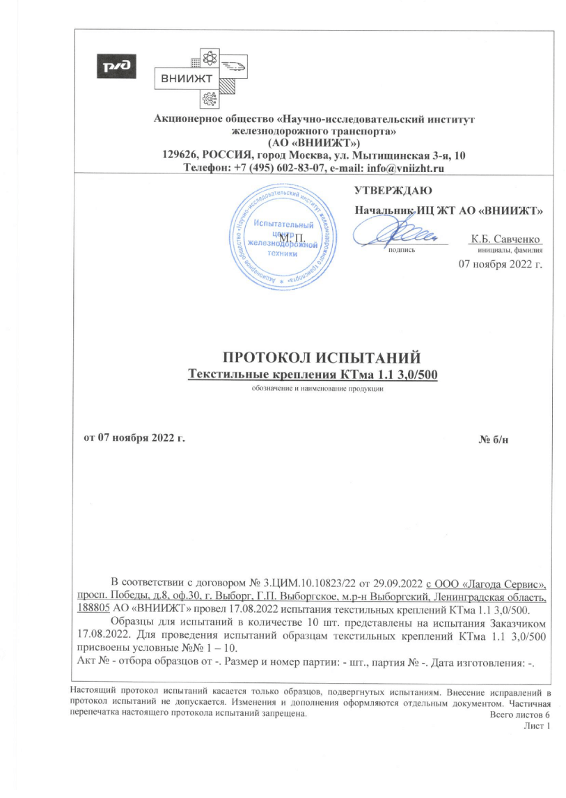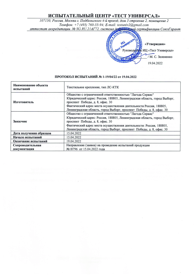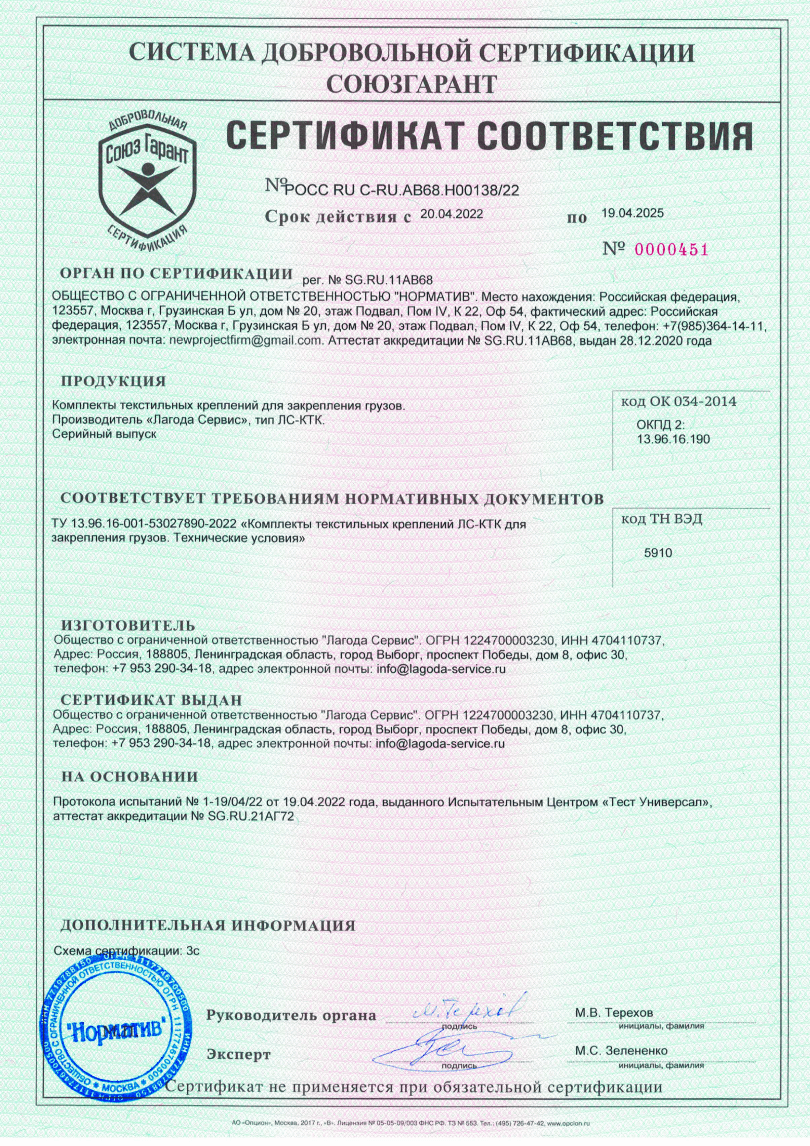Компания ООО «Лагода Сервис» является производителем текстильных креплений, которые прошли испытания, предусмотренные Техническими требованиями к средствам крепления грузов в вагонах и контейнерах с использованием текстильных лент, утвержденых Распоряжением РЖД №2557/р от 18.11.2019